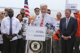 Rhode Island Gov. Dan McKee talks about the importance of the Revolution Wind offshore wind farm to the state's economy and energy future during a news conference in North Kingstown, R.I., on Monday, Aug. 25, 2025. (AP Photo/Jennifer McDermott)