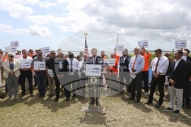 Patrick Crowley, president of the Rhode Island AFL-CIO, calls on the Trump administration to allow work to resume on the Revolution Wind offshore wind farm during a news conference in North Kingstown, R.I., Monday, Aug. 25, 2025. (AP Photo/Jennifer McDermott)