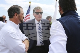 Rhode Island Gov. Dan McKee, center, speaks with Laborers' International Union of North America leaders Donato Bianco, left, and Michael Sabitoni, right, after a news conference in North Kingstown, R.I., on Monday, Aug. 25, 2025. Democratic politicians and union leaders called on the Trump administration to allow work to continue on the Revolution Wind offshore wind farm. (AP Photo/Jennifer McDermott)