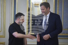 German Vice Chancellor and Finance Minister Lars Klingbeil, right, shakes hands with Ukrainian President Volodymyr Zelenskyy during their meeting in Kyiv, Ukraine, Monday, Aug. 25, 2025. (AP Photo/Efrem Lukatsky)