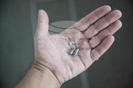 A member of the MV Ocean Viking, search and rescue vessel chartered by non profit group nonprofit SOS Mediterranee, shows bullets which, according to the organisation, were fired on its vessel by the Libyan Coast Guard, approximately 40 Nautical Miles north of the Libyan coast, Sunday, Aug. 24, 2025. (Max Cavallari/SOS Mediterranee Via AP)