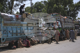 Afghan refugee families heading back to their homeland, gather next to trucks loaded with their belongings as they wait for documentation at the UNHCR Voluntary Repatriation Centre in Azakhel, Nowshera a district of Pakistan's Khyber Pakhtunkhwa, Monday, Aug. 25, 2025. (AP Photo/Muhammad Sajjad)