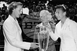 FILE - From left, Angela Mortimer, Hazel H. Wightman and Maureen Connolly are seen following a match between Mortimer and Connolly at the 25th Wightman Cup competition in Rye, N.Y., on Aug. 1, 1953. (AP Photo/Harry Harris, File)