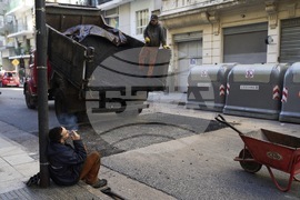 Workers take a break from repaving a street in Buenos Aires, Argentina, Monday, Aug. 25, 2025. (AP Photo/Rodrigo Abd)
