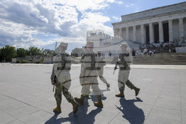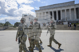 Armed members of the West Virginia National Guard patrol around the Lincoln Memorial in Washington, Tuesday, Aug. 26, 2025. (AP Photo/Rod Lamkey, Jr.)