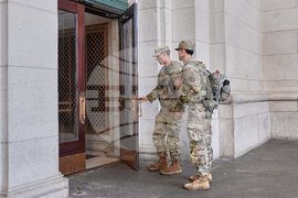 Armed National Guard soldiers from West Virginia patrol the Mall near the Labor Department in Washington, where a poster of President Donald Trump is displayed, Tuesday, Aug. 26, 2025. (AP Photo/J. Scott Applewhite)
