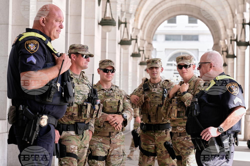 Amtrak police officers and armed members of the Louisiana National Guard talks as they patrol at Union Station, Tuesday, Aug. 26, 2025, in Washington. (AP Photo/Mariam Zuhaib)