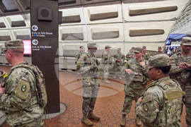 Members of the Louisiana National Guard patrol Union Station, Tuesday, Aug. 26, 2025, in Washington. (AP Photo/Mariam Zuhaib)