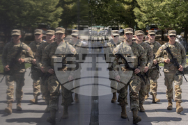 Armed National Guard soldiers walk along Constitution Avenue in Washington as part of President Donald Trump's order to impose federal law enforcement in the nation's capital, Tuesday, Aug. 26, 2025. (AP Photo/J. Scott Applewhite)