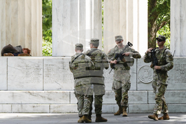 Armed National Guardsmen patrol at the Korean War Veterans Memorial, Tuesday, Aug. 26, 2025, in Washington. (AP Photo/Julia Demaree Nikhinson)