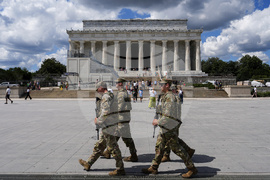 National Guardsmen patrol near the Lincoln Memorial, Tuesday, Aug. 26, 2025, in Washington. (AP Photo/Julia Demaree Nikhinson)