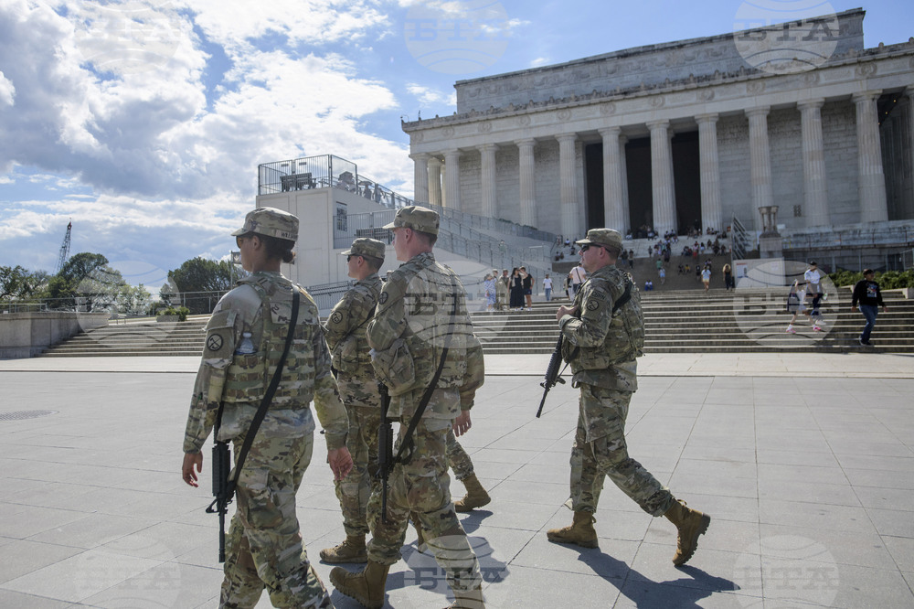 Armed members of the West Virginia National Guard are positioned across from the Lincoln Memorial in Washington, Tuesday, Aug. 26, 2025. (AP Photo/Rod Lamkey, Jr.)