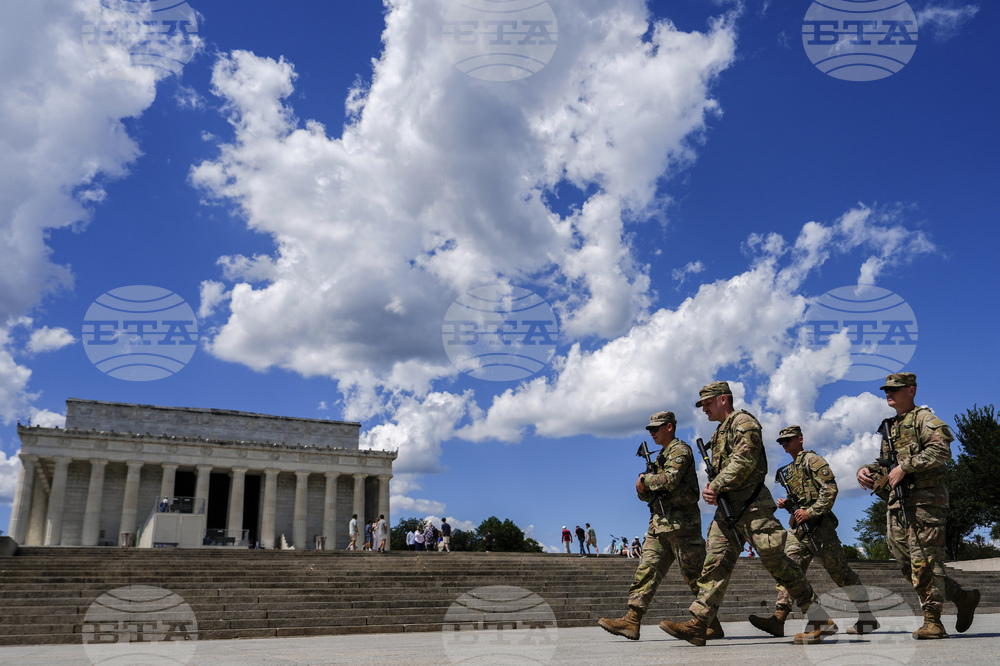 Armed members of the West Virginia National Guard patrol around the Lincoln Memorial in Washington, Tuesday, Aug. 26, 2025. (AP Photo/Rod Lamkey, Jr.)