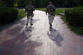 Armed members of the West Virginia National Guard patrol the Korean War Veterans Memorial in Washington, Tuesday, Aug. 26, 2025. (AP Photo/Rod Lamkey, Jr.)