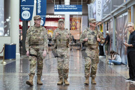 Members of the Louisiana National Guard talk as they patrol Union Station, Tuesday, Aug. 26, 2025, in Washington. (AP Photo/Mariam Zuhaib)
