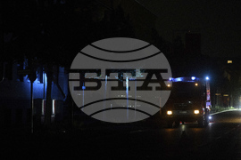 An emergency vehicle from the German Red Cross (DRK) with its blue lights on is parked in a street in Adlershof during a widespread power cut in south-east Berlin, Tuesday, Sept. 9, 2025. (Bernd von Jutrczenka/dpa via AP)