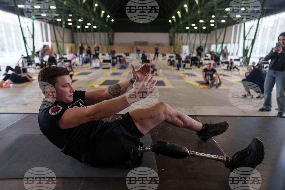 A Ukrainian war veteran exercises during open sports workshop for amputee soldiers in Kyiv, Ukraine, on Wednesday, Sept. 24, 2025. (AP Photo/Evgeniy Maloletka)