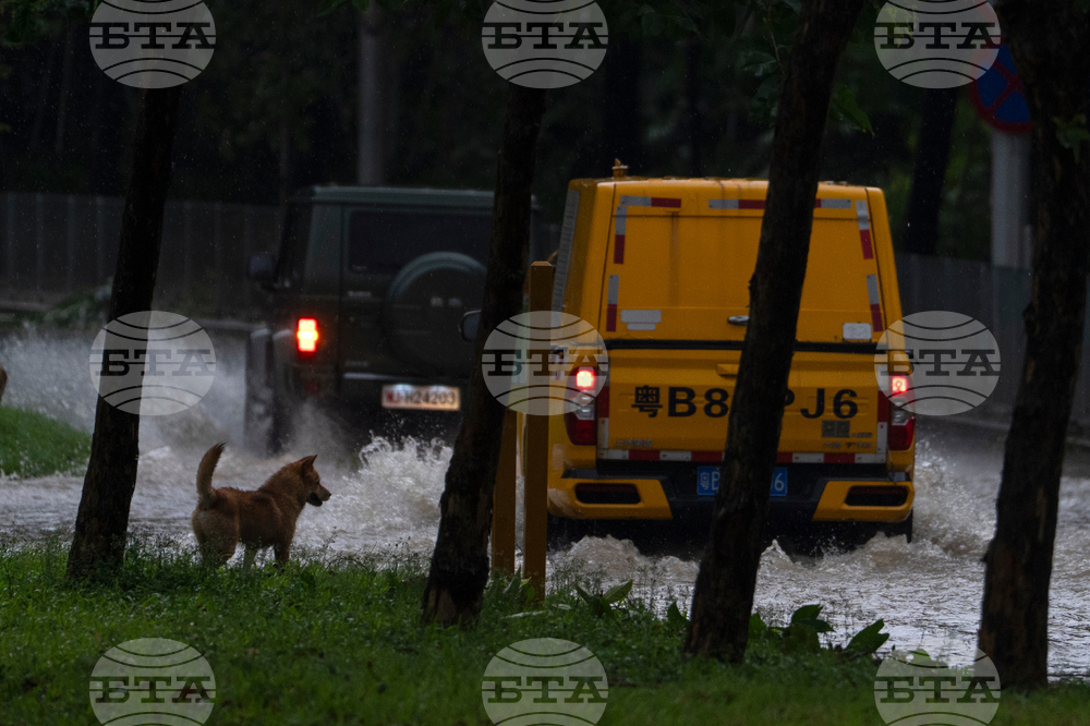 A dog watches as vehicles drive through flood waters in the aftermath of Super Typhoon Ragasa in Shenzhen in southern China's Guangdong province on Wednesday, Sept. 24, 2025. (AP Photo/Ng Han Guan)