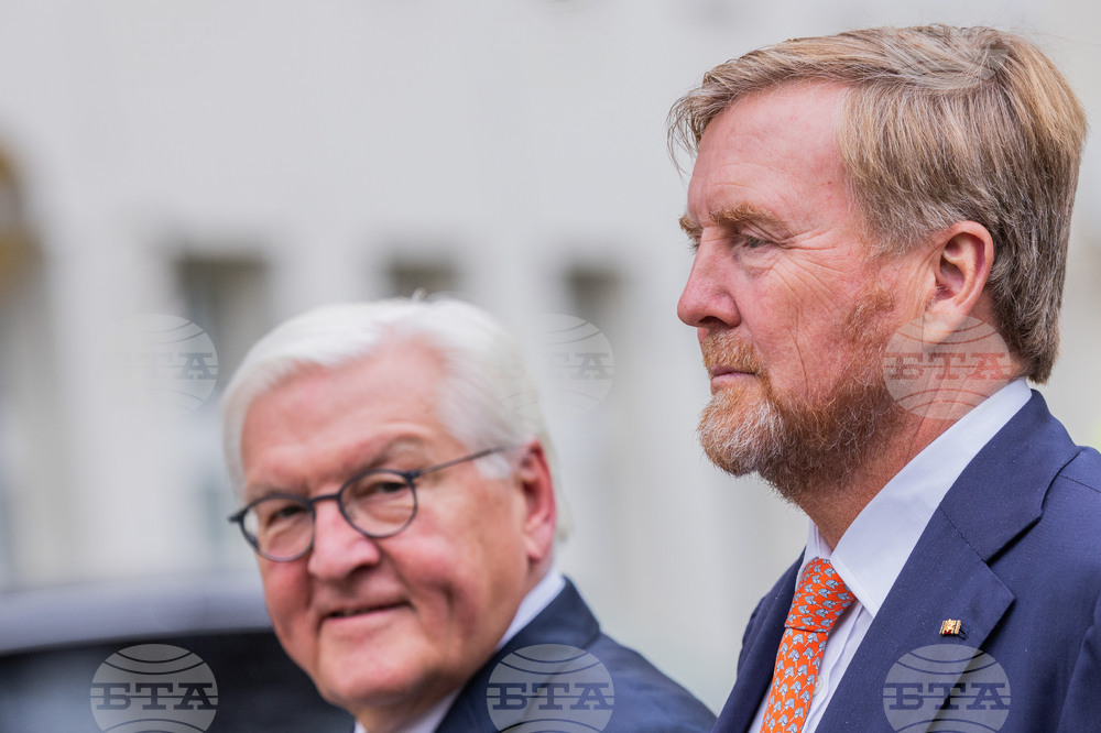 Dutch King Willem-Alexander, left, and German President Frank-Walter Steinmeier arrive at Wilkinghege Palace in Muenster, Germany, Thursday Sept. 25, 2025. (Rolf Vennenbernd/dpa via AP)