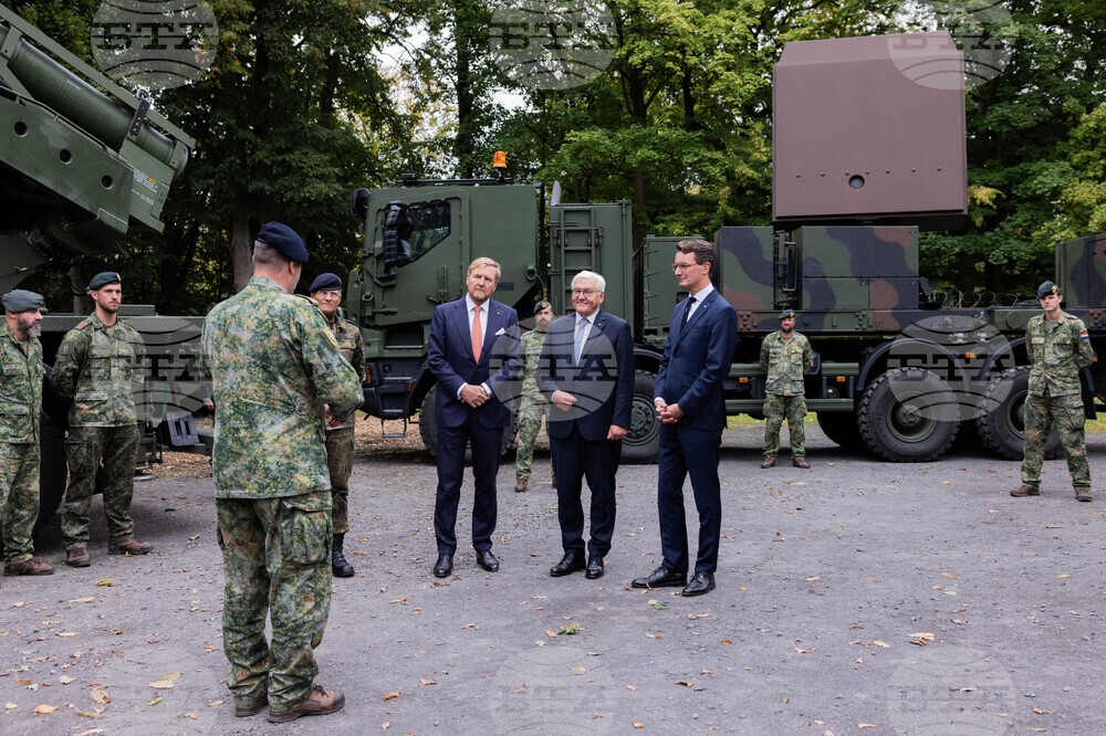 Dutch King Willem-Alexander, left, and German President Frank-Walter Steinmeier inspect military equipment during a visit to the I German-Dutch Corps, in Muenster, Germany, Thursday Sept. 25, 2025. (Rolf Vennenbernd/dpa via AP)