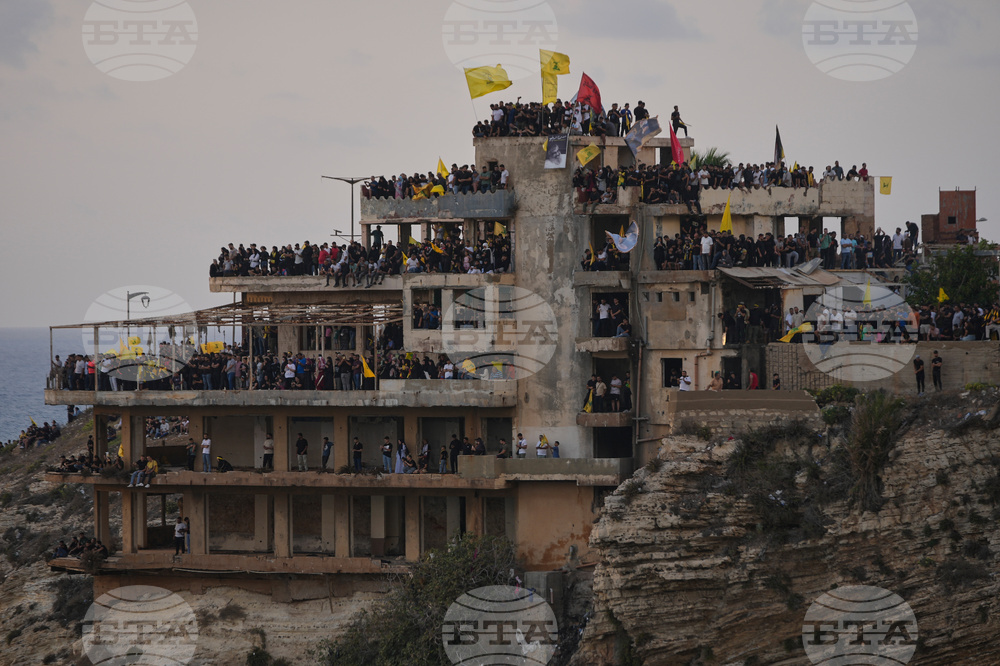 Hezbollah supporters stand on building to watch the landmark Raouche sea rock which illuminated by a portrait of late Hezbollah leader Sayyed Hassan Nasrallah during an event commemorating his anniversary assassination, in Beirut, Lebanon, Thursday, Sept. 25, 2025. (AP Photo/Hussein Malla)