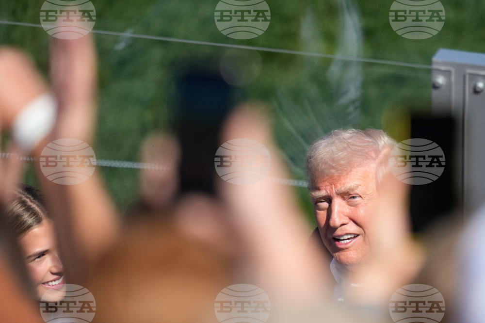 President Donald Trump greets the crowd accompanied by his granddaughter Kai Trump, left, as he arrives at the Ryder Cup golf tournament on the Bethpage Black golf course in Farmingdale, N.Y., Friday, Sept. 26, 2025. (AP Photo/Alex Brandon)