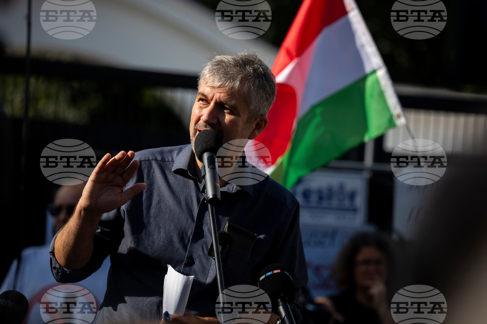 Independent lawmaker Ákos Hadházy gives a speech during a protest outside Hatvanpuszta, a country estate linked to alleged corruption involving Prime Minister Viktor Orbán, near Alcsútdoboz in Hungary, Saturday, Sept. 27, 2025. (AP Photo/Denes Erdos)