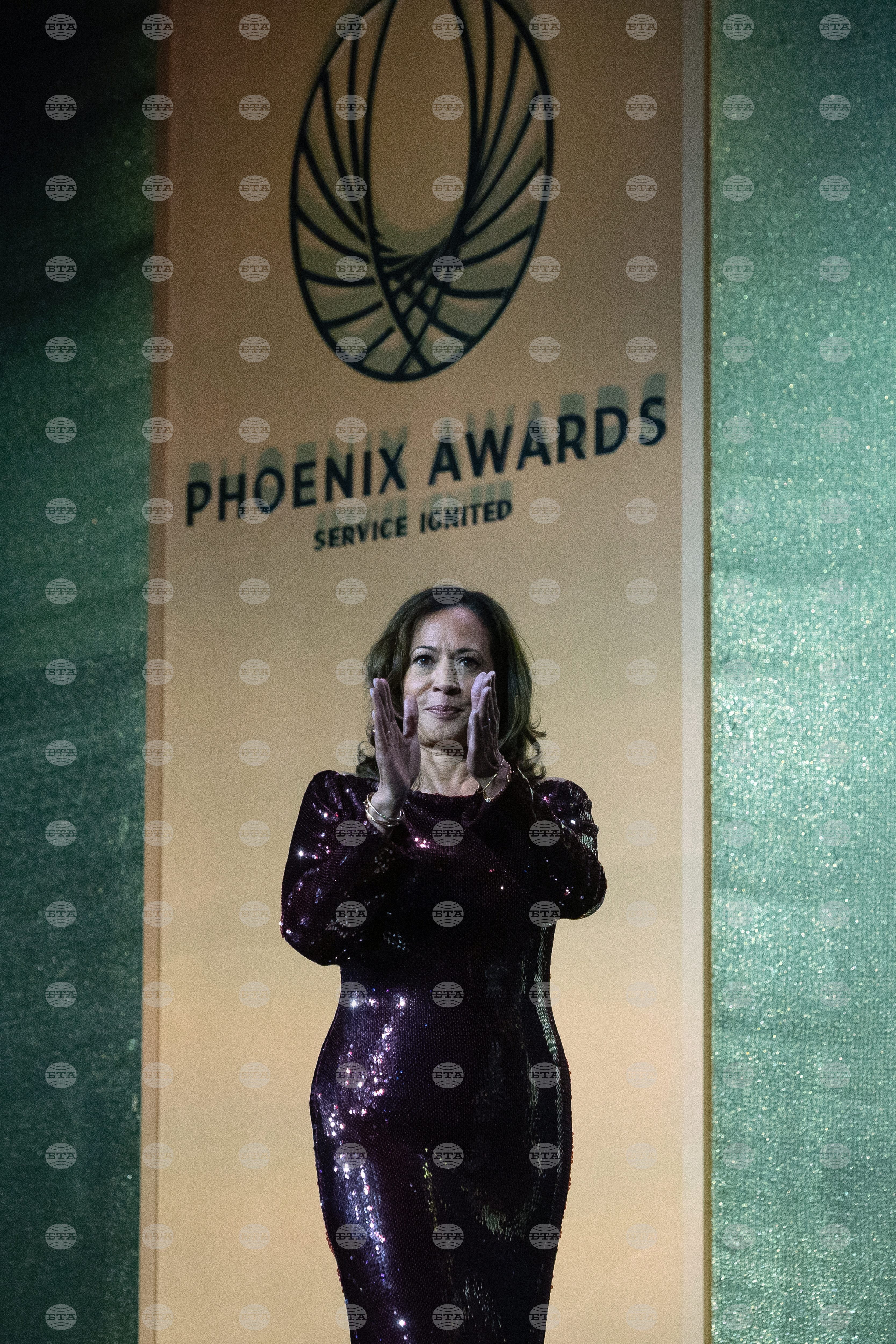 Former Vice President Kamala Harris receives the Congressional Black Caucus Foundation Phoenix Award, in Washington, Saturday, Sept. 27, 2025. (AP Photo/Cliff Owen