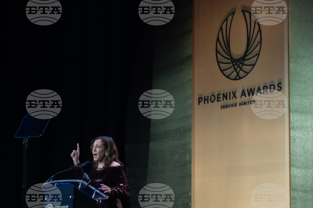 Former Vice President Kamala Harris receives the Congressional Black Caucus Foundation Phoenix Award, in Washington, Saturday, Sept. 27, 2025. (AP Photo/Cliff Owen)