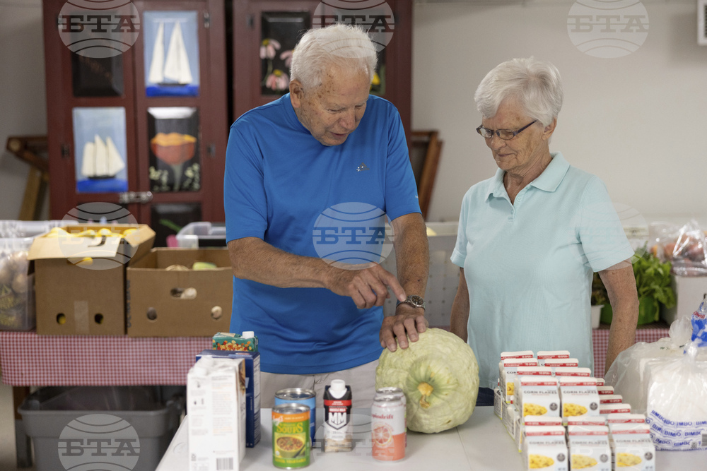Keith Ritchie, 89, and Betty Williams, 88, the Neighbor's Cupboard pantry's two eldest volunteers, in Winterport, Maine, on Wednesday, Sept. 3, 2025. (Katherine Emery/The Maine Monitor via AP)