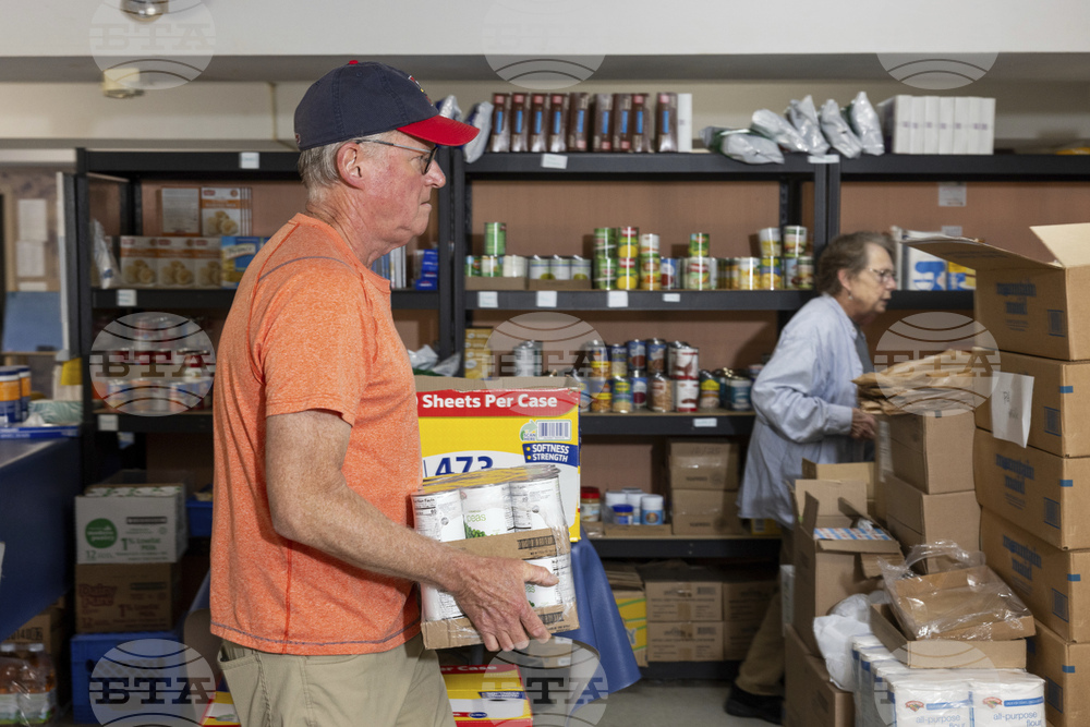 Phylis Allen organizes supplies at Neighbor's Cupboard in Winterport, Maine, on Tuesday, Aug. 26, 2025, a food pantry that she has helped run for the past 17 years. (Katherine Emery/The Maine Monitor via AP)