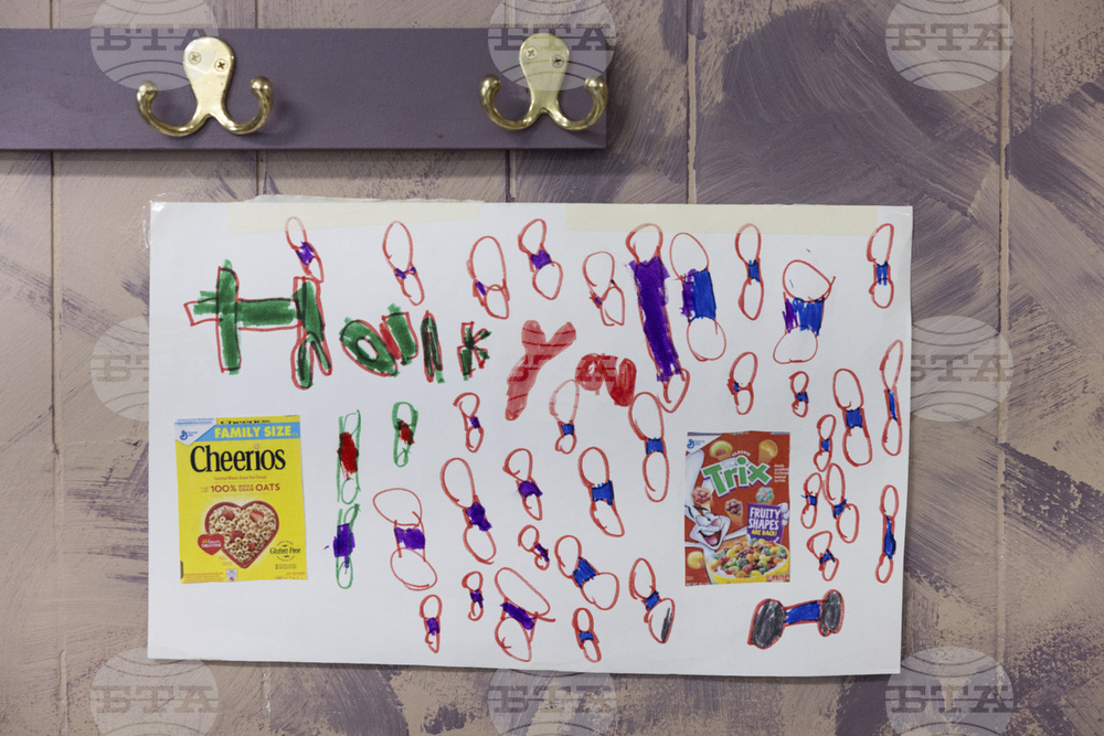 Thank you notes from children in the community are posted in the Neighbor's Cupboard pantry in Winterport, Maine, on Tuesday, Aug. 26, 2025. (Katherine Emery/The Maine Monitor via AP)