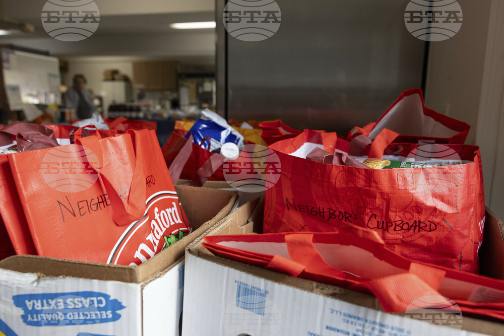 Bags of food are prepared for home deliveries at the Neighbor's Cupboard pantry in Winterport, Maine, on Tuesday, Aug. 26, 2025. (Katherine Emery/The Maine Monitor via AP)