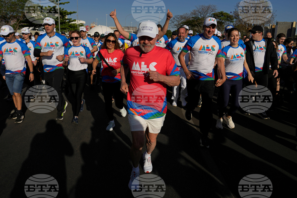 Brazil's President Luiz Inacio Lula da Silva, front, takes part in the walk in celebration of the 95th anniversary of the Ministry of Culture, in Brasilia, Brazil, Sunday, Sept. 28, 2025. (AP Photo/Eraldo Peres)