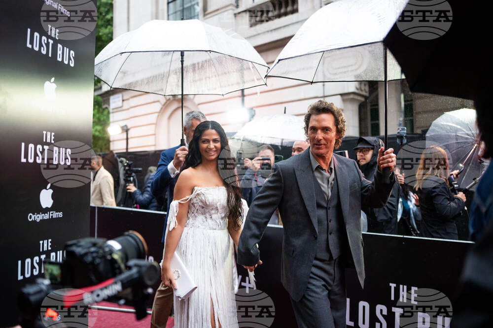 Camila Alves, left, and Matthew McConaughey pose for photographers upon arrival at the screening of the film 'The Lost Bus' on Sunday, Sept. 28, 2025, in London. (Photo by Scott A Garfitt/Invision/AP)