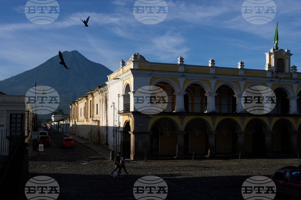 People walk past the Palacio de los Capitanes in Antigua, Guatemala, Sunday, Sept. 28, 2025. (AP Photo/Moises Castillo)