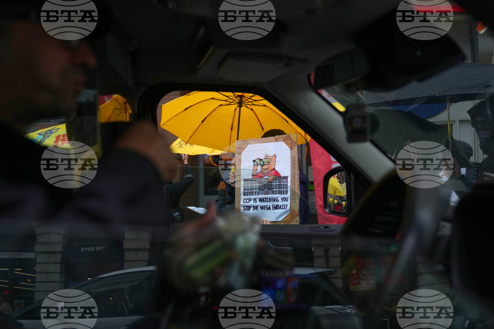 Protesters hold umbrellas, placards, and flags as they demonstrate against the proposed building of a new Chinese embassy, and to mark the 11th year of the Umbrella Revolution in Hong Kong, in London, Sunday, Sept. 28, 2025. (AP Photo/Joanna Chan)