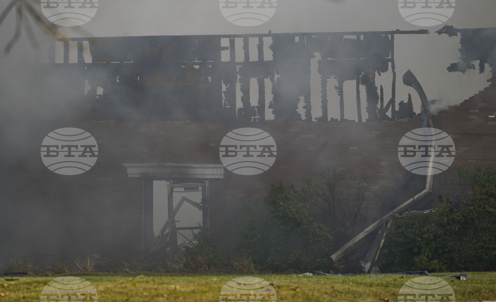 Firefighters try to extinguish a fire at the Church of Jesus Christ of Latter-day Saints in Grand Blanc, Mich., Sunday, Sept. 28, 2025. (Lukas Katilius/The Flint Journal via AP)