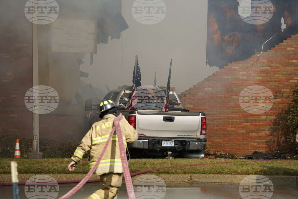 A vehicle that was rammed into the building is surrounded by smoke as a firefighter works on the scene at the Church of Jesus Christ of Latter-day Saints in Grand Blanc, Mich., Sunday, Sept. 28, 2025. (Lukas Katilius/The Flint Journal via AP)