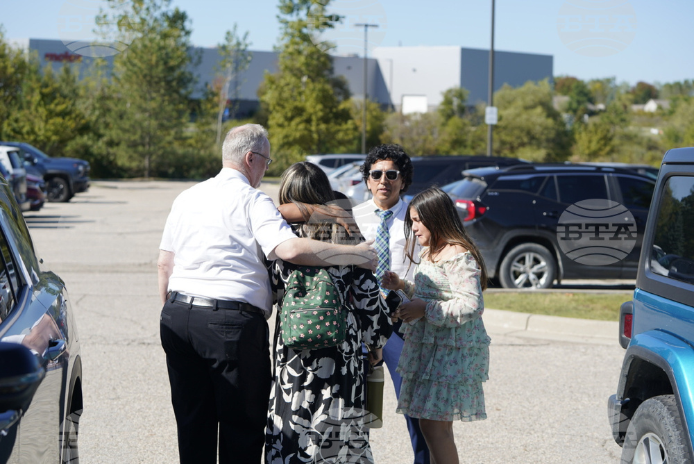 People meet at a reunification area at the Trillium Theater after an active shooter incident and fire at The Church of Jesus Christ of Latter-day Saints in Grand Blanc, Mich on Sunday, Sept. 28, 2025. (Lukas Katilius/The Flint Journal via AP)