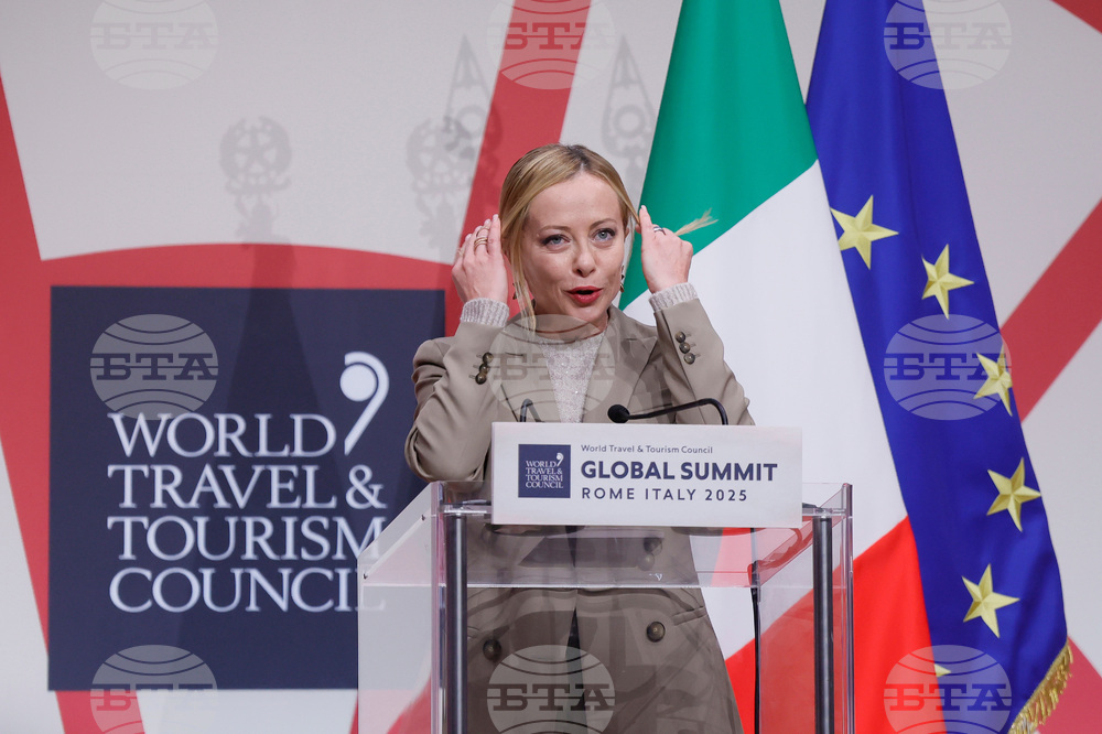 Italian Premier Giorgia Meloni speaks at the Global Summit World Travel and Tourism Council in Rome, Monday, Sept. 29 , 2025. (Cecilia Fabiano/LaPresse via AP)