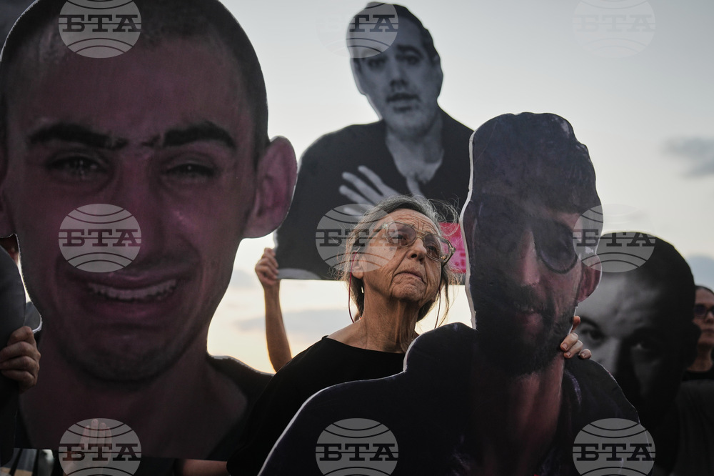 Demonstrators hold photos depicting the faces of Israeli hostages who are being held in the Gaza Strip, during a protest demanding their release and urges a ceasefire in front of the U.S. Embassy branch office in Tel Aviv, Israel, Monday, Sept. 29, 2025. (AP Photo/Ariel Schalit)