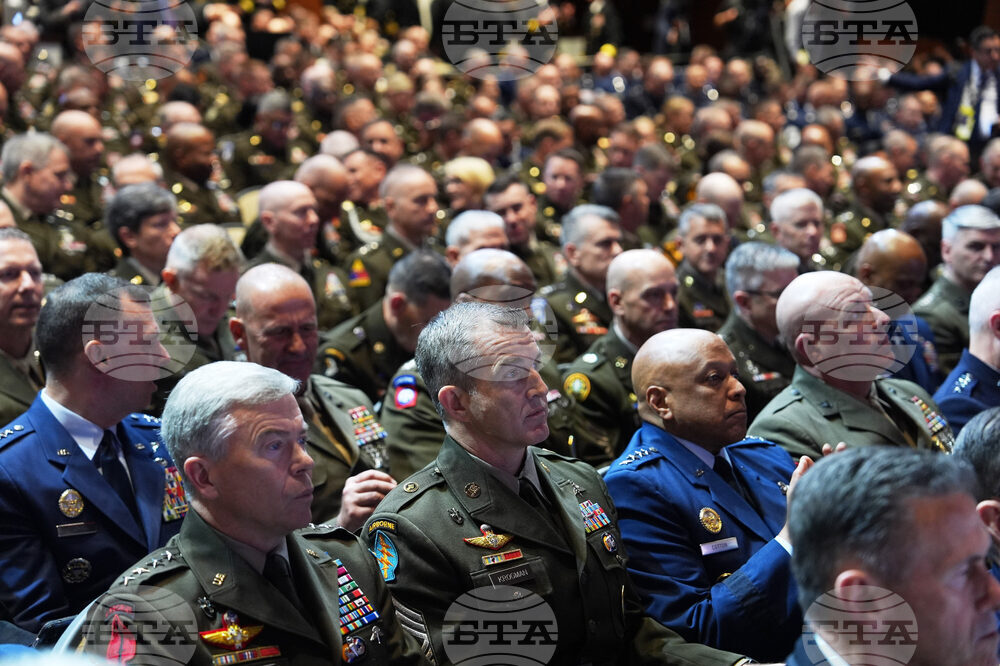 U.S. military senior leadership are seen before President Donald Trump arrives to speaks at Marine Corps Base Quantico, Tuesday, Sept. 30, 2025 in Quantico, Va. (AP Photo/Evan Vucci)