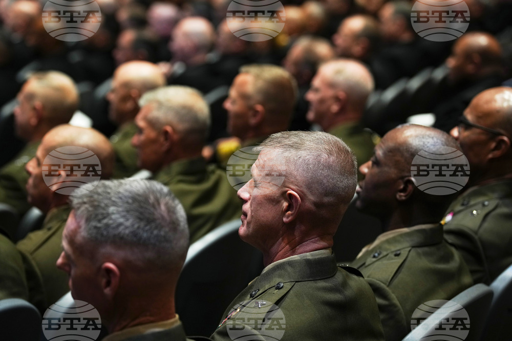 U.S. military senior leadership listen at Marine Corps Base Quantico, Tuesday, Sept. 30, 2025 in Quantico, Va. (AP Photo/Evan Vucci)