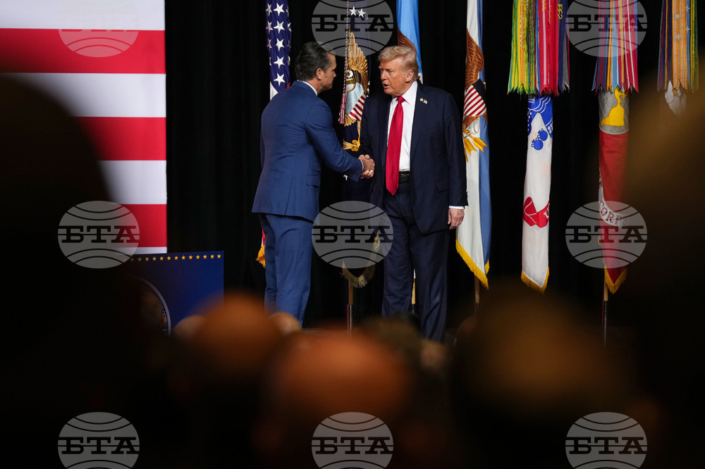 President Donald Trump is greeted by Secretary of Defense Pete Hegseth before speaking to a gathering of top U.S. military commanders at Marine Corps Base Quantico, Tuesday, Sept. 30, 2025, in Quantico, Va. (Andrew Harnik/Pool via AP)