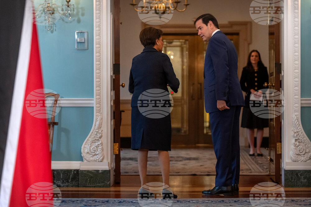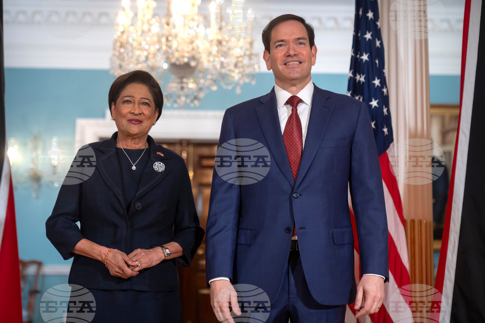 Secretary of State Marco Rubio, right, stands with Trinidad and Tobago Prime Minister Kamla Persad-Bissessar at the State Department, Tuesday, Sept. 30, 2025, in Washington. (AP Photo/Mark Schiefelbein).