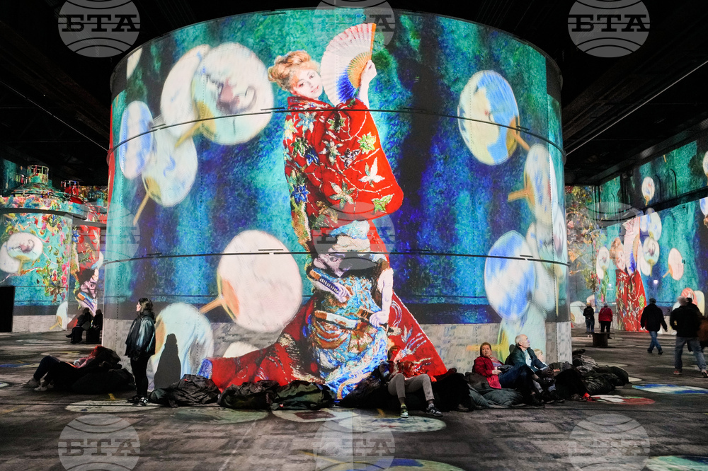 Visitors watch a digital immersive art exhibition, with 360-degree video projections, about French painter and founder of Impressionism Claude Monet at the historical former puddling and rolling steel mill Phoenix in Dortmund, Germany, Tuesday, Sept. 30, 2025. (AP Photo/Martin Meissner)