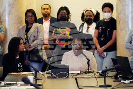 FILE - Arkela Lewis, bottom right, mother of Jaylen Lewis, who was shot to death during an encounter with officers of the Mississippi Capitol Police department, testifies before members of the Jackson delegation of the Mississippi Legislature at the Mississippi Capitol in Jackson, March 6, 2023. (AP Photo/Rogelio V. Solis, File)