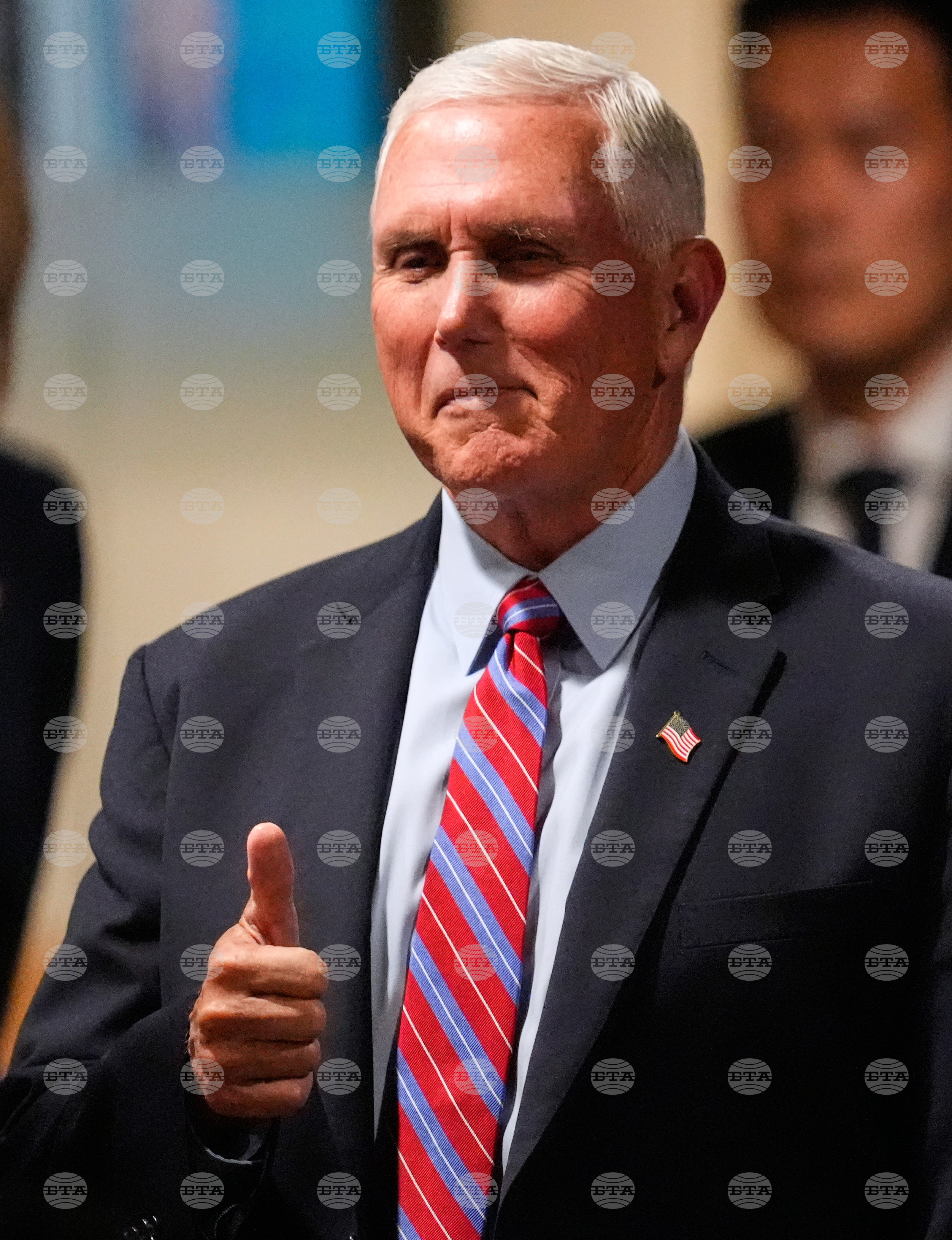Former Vice President Mike Pence flashes a thumb up while being introduced at the Harvard Kennedy School's John F. Kennedy Jr. Forum, Tuesday, Sept. 30, 2025, in Cambridge, Mass. (AP Photo/Charles Krupa)
