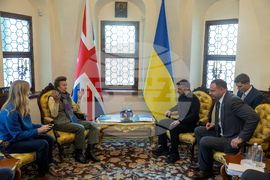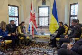 Ukraine's President Volodymyr Zelenskyy, center right, meets Britain's Princess Anne in Kyiv, Tuesday Sept. 30, 2025. (Thomas Peter/Pool via AP)